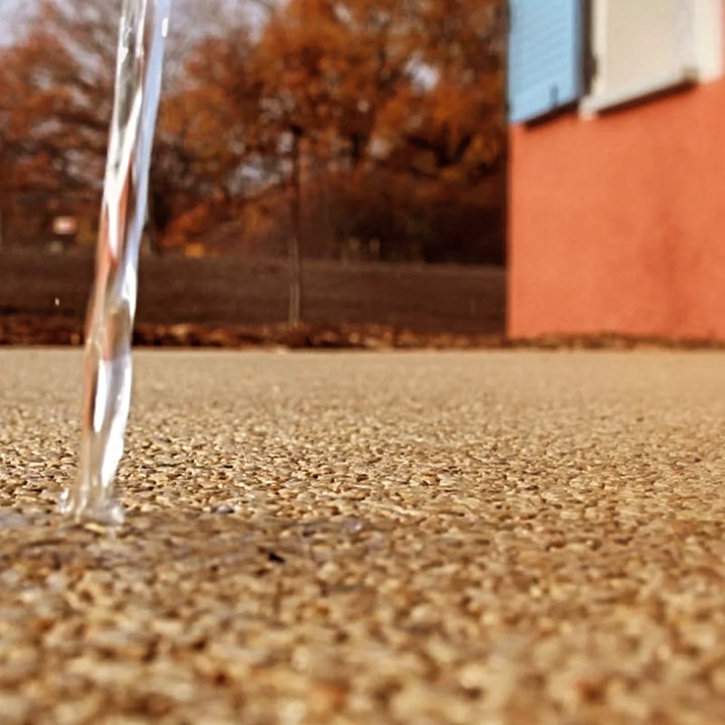 La résine Hydroway est une solution perméable à l’eau qui laisse passer les eaux de pluie directement dans le sol, sans ruissellement ni flaque.